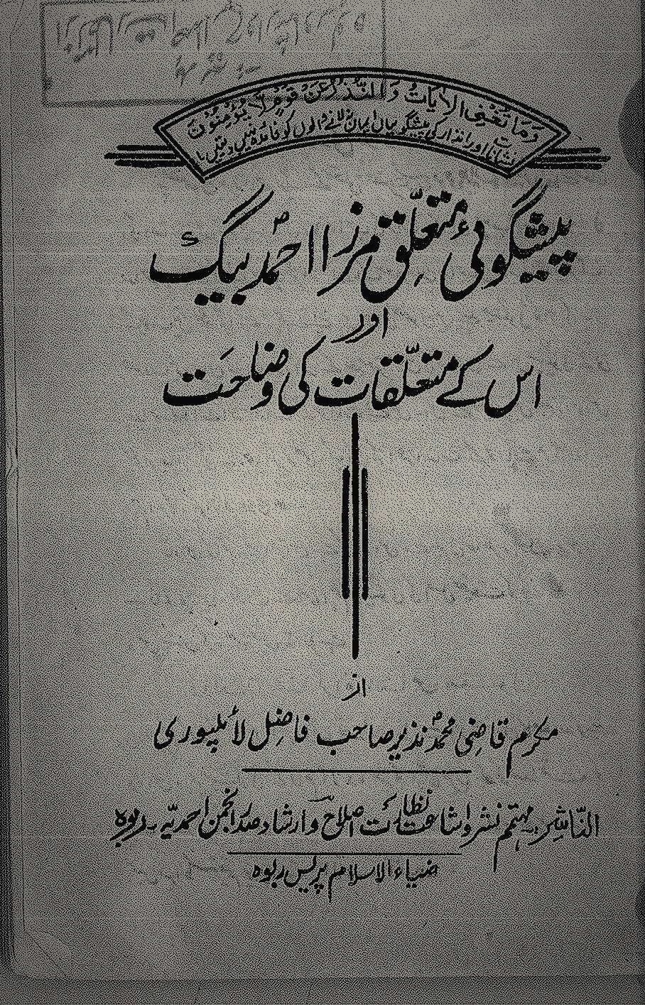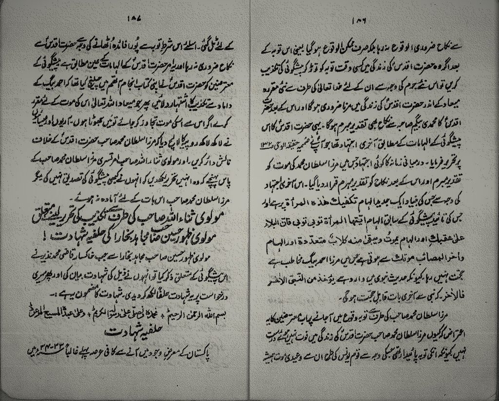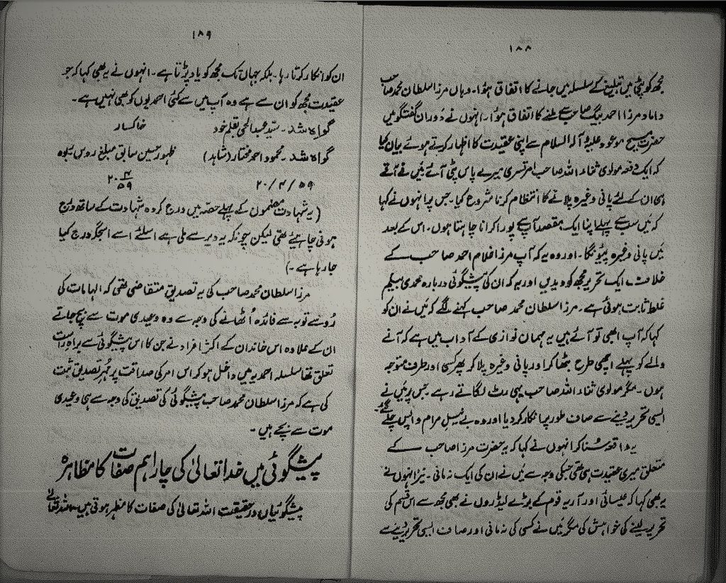 قبل مدة من استقلال باكستان في 1933 أو 1934 على أغلب الظن، سنح لي الذهاب إلى منطقة بتي قصد التبليغ، وهناك صادف لي مقابلةُ مرزا سلطان محمد المحترم صهرِ مرزا أحمد بيك. فقال لي أثناء الحديث معربا عن عواطف الاعتقاد والتعظيم لسيدنا المسيح الموعود : ذات يوم جاءني المولوي ثناءُ الله الأمرتسري في “بتي” فبدأت فورَ رؤيته أدبّر له الضيافة. فقال المولوي: أولا أود أن أذكر لك طلبي وبعد ذلك سأشرب الماء، وطلبي أن تكتب لي تصريحا خطيا أن نبوءة مرزا غلام أحمد بخصوص محمدي بيغم بطلت. فقلت له: من آداب الضيافة أن أُجلسك أولا وأقدم لك الماء وغيره، ثم ألتفت إلى أمر آخر. لكن المولوي ظل يردد قوله. فرفضتُ إعطاءه مثل هذا التصريح الخطي بجلاء، فعاد خائبا.