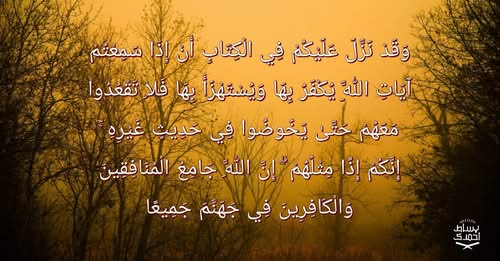 {وَقَدْ نَزَّلَ عَلَيْكُمْ فِي الْكِتَابِ أَنْ إِذَا سَمِعْتُمْ آيَاتِ اللَّهِ يُكْفَرُ بِهَا وَيُسْتَهْزَأُ بِهَا فَلَا تَقْعُدُوا مَعَهُمْ حَتَّى يَخُوضُوا فِي حَدِيثٍ غَيْرِهِ إِنَّكُمْ إِذًا مِثْلُهُمْ إِنَّ اللَّهَ جَامِعُ الْمُنَافِقِينَ وَالْكَافِرِينَ فِي جَهَنَّمَ جَمِيعًا } (النساء 141)